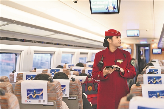12月10日,京津城际C2002次列车长白蕊在车厢内巡视。当日,京津城际实施新的列车运行图,优化京津两地早晚高峰列车开行方案。新华社记者 李然 摄