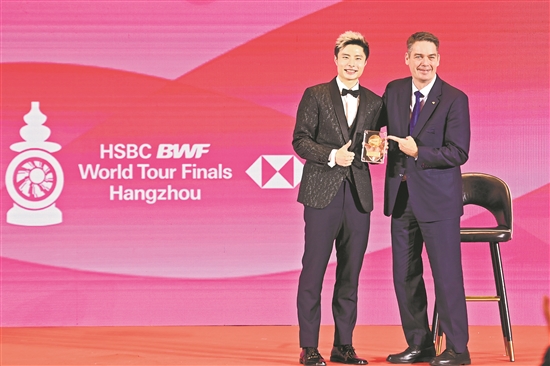 世界羽联主席拉尔森为中国选手石宇奇(左)颁奖。新华社记者 黄宗治 摄