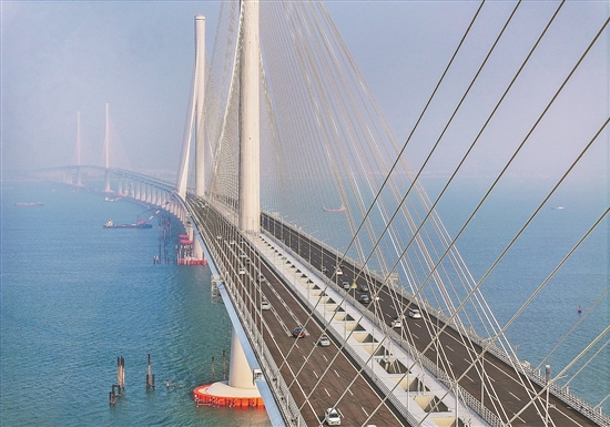 图为12月11日黄茅海跨海通道正式通车后,车辆行驶在黄茅海大桥上。新华社记者 刘大伟 摄