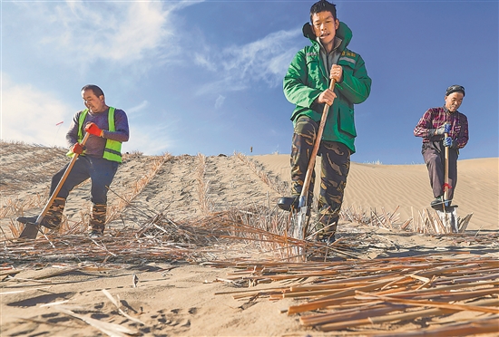 工人在新疆和田地区民丰县后河坝沙漠阻击区补扎草方格。近日,在新疆于田县,环绕塔克拉玛干沙漠边缘全长3046公里的绿色阻沙防护带实现全面锁边“合龙”。数十万人40余载奋斗,终在大漠边缘筑起一道绿色长城。新华社记者 王菲 摄