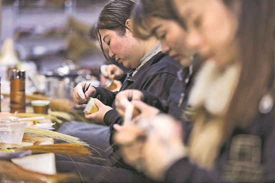 12月13日,在江西省萍水市湘东区江口艺术村三石竹艺博物馆,工人们捏着直径不足1毫米的竹丝在瓷胎上细心编织。