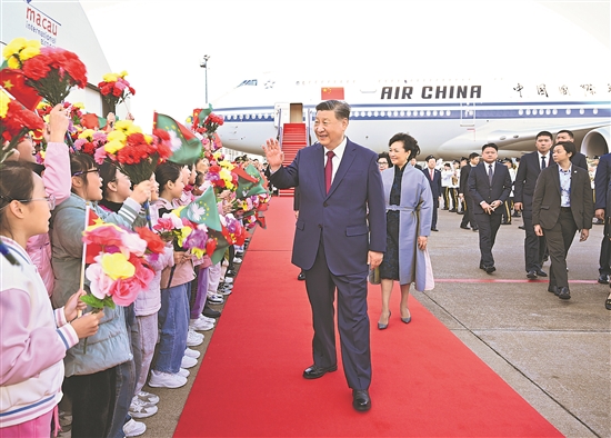 16时许,习近平乘坐的专机徐徐降落在澳门国际机场。习近平和夫人彭丽媛走出舱门,向欢迎人群挥手致意。澳门警察乐队奏响热情洋溢的欢迎曲,舞龙舞狮表演喜气欢腾。舷梯旁,两名少年儿童向习近平和彭丽媛献上鲜花。在澳门特别行政区行政长官贺一诚和夫人郑素贞陪同下,习近平和彭丽媛同前来迎接的人员亲切握手。数百名澳门青少年和各界群众代表挥动国旗、特别行政区区旗和鲜花,表达热烈的欢迎。