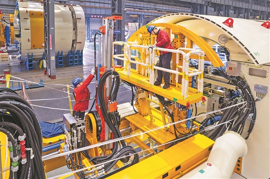 12月18日,工人在铁建重工长沙第二产业园调试“中国有色二号”掘进机(无人机照片)。
