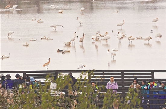 人们在江西省南昌市高新区的白鹤小镇观鸟步道内,近距离观察白鹤等候鸟(12月17日摄)。2020年,当地政府筹建了白鹤小镇。如今的白鹤小镇已具备科普研学、人文体验、休闲农业、旅居生活的功能。白鹤小镇成为鄱阳湖畔的“候鸟乐园”,也见证着人与自然和谐共生的绿色发展之路。 新华社记者 万象 摄