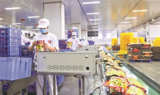 广西柳州螺蛳粉产业园一家螺蛳粉生产企业工作人员在包装螺蛳粉(11月13日摄)。