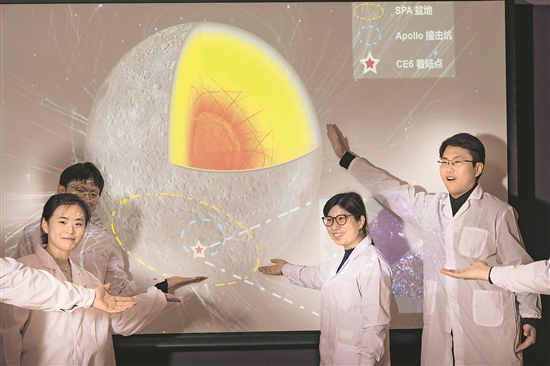 12月20日,在中国科学院地质与地球物理研究所,蔡书慧副研究员(右二)和部分团队成员在展示科研成果的示意图前留影。