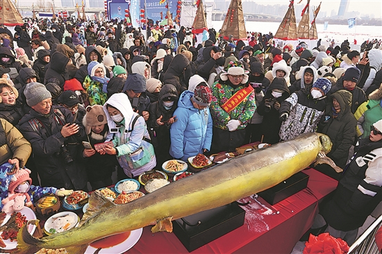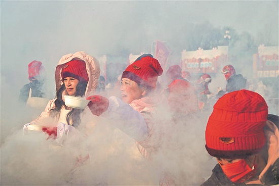 12月7日,以“采头冰·庆亚冬”为主题的第五届哈尔滨采冰节在松花江北岸举行。仪式结束后,工作人员现场用大铁锅烹饪饺子、江鱼等美食,供游客免费品尝。