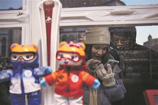 12月18日,在位于索菲亚教堂的第9届亚冬会特许零售店外,两名游客正在查询亚冬会的相关信息。