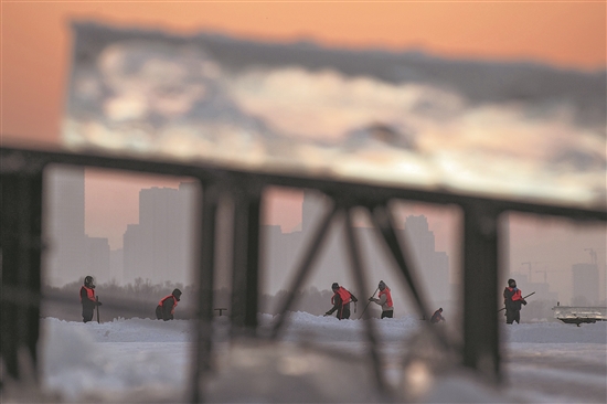 12月9日,在哈尔滨松花江上的职业采冰人。近些年来,随着用冰需求的增大,越来越多的机械设备投入采冰作业中,大幅提升了作业效率和安全性。