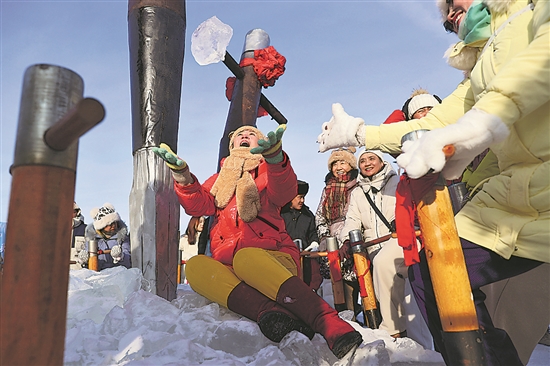 12月7日,在哈尔滨采冰节现场,游客们体验采冰的乐趣。