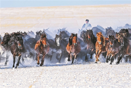 12月12日,东乌珠穆沁旗的牧民在雪原上驯马。冬季内蒙古锡林郭勒盟东乌珠穆沁旗的草原被白雪覆盖,牧民赶着马群在雪原上驯马,为八方游客呈现了骏马奔腾的壮观景象。新华社记者 彭源 摄