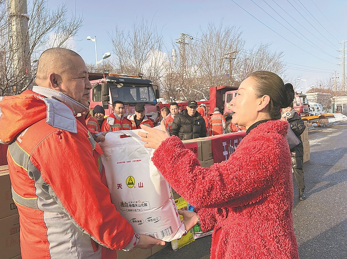 12月22日,新疆乌鲁木齐天山区总工会开展“两节”送温暖活动,为2100余名环卫工人送去了大米、面粉、食用油等慰问品。本报记者 吴铎思 本报通讯员 迪丽胡玛尔·阿力甫 摄
