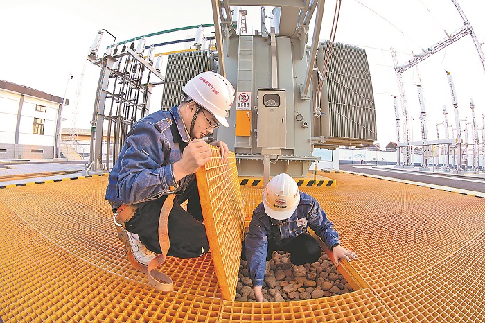 近日,中国铁建电气化局南方公司杭衢高铁项目部,针对牵引变电所交叉作业专业多的情况,开展质量互检、互监、互比、互评和互赛活动。图为该项目技术人员在检查变压器油池网格栅施工工艺和质量情况。