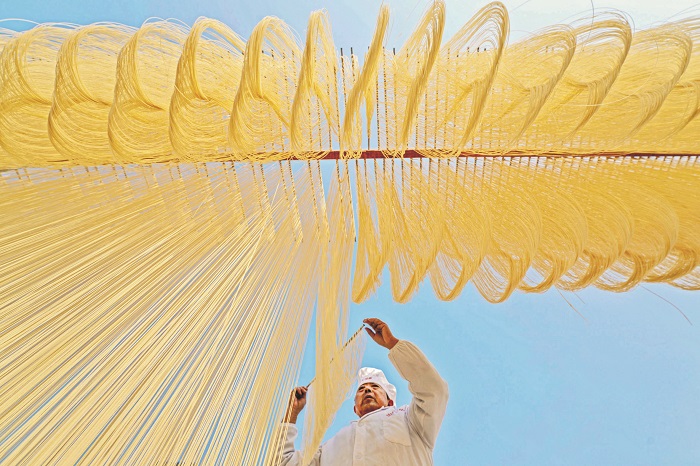 12月21日,安徽省合肥市肥东县牌坊乡魏武社区合肥益农食品公司内,工人们在制作手工挂面。
