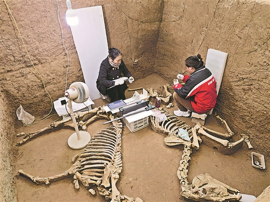 图为2024年11月6日考古工作人员清理祭祀坑出土的马骨。中新社发 中国社会科学院考古研究所安阳工作队 供图