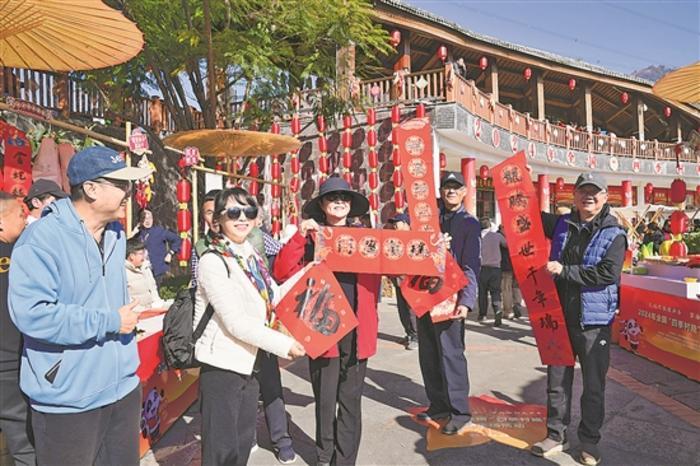 12月30日,游客在乡村年货大集上展示春联。