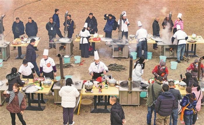 12月27日,在贵州省铜仁市玉屏侗族自治县侗乡风雨桥景区,厨师在现场烹饪,吸引游客驻足围观。当日,该景区举行“侗菜厨艺比拼迎新年”活动,来自湖南和贵州的28名厨师参赛。本报通讯员 胡攀学 摄
