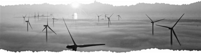 山东荣成,海上风电场日出时分云雾飘渺,宛如仙境。视觉中国 供图