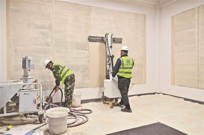 石膏粉刷工张猛(右)第一次使用“机器人”抹灰。林志伟 摄