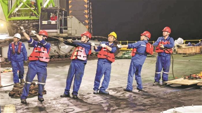 海上风电安装班组工人在牵拉缆风绳。刘家晖 李小康 摄