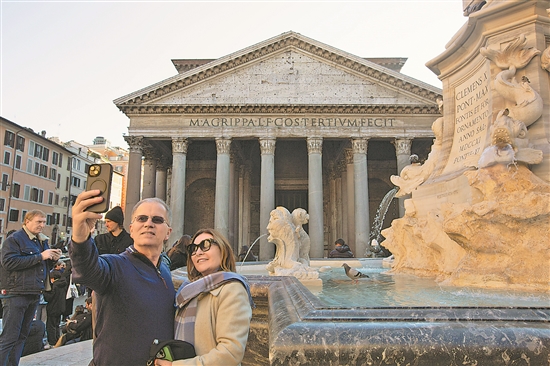 新年到来之际,意大利罗马多处知名建筑、景点持续数月的修缮翻新工程结束,陆续对游客开放。图为近日,人们在意大利罗马参观翻新后的万神殿喷泉。新华社记者 李京 摄