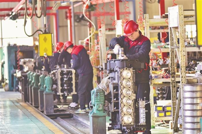 1月2日,工人在山东省青州市何官镇一家发动机制造企业的车间内工作。