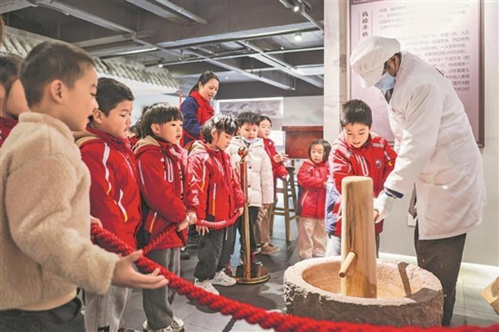 1月3日,小朋友在浙江宁波江北区慈城年糕博物馆内体验年糕的传统制作方式。入冬以来,在有着“中国年糕之乡”美誉的慈城镇,年糕企业产销两旺,“年糕经济”成为当地冬日里的火热名词。新华社记者 江汉 摄