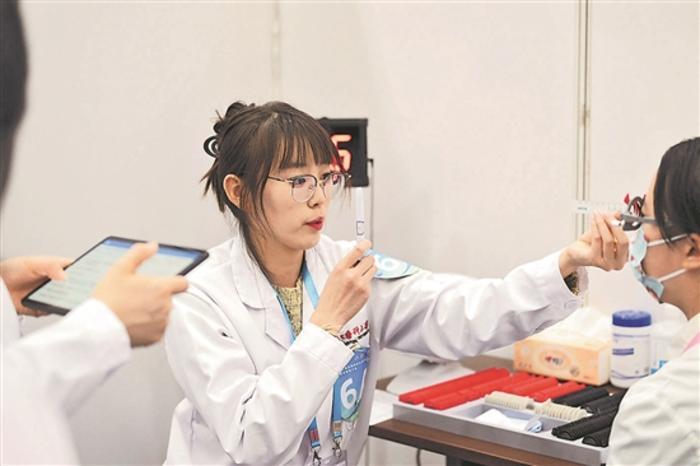 近日,第二届全国眼视光医学专业本科生临床技能大赛在天津医科大学举办。来自全国19个院校眼视光医学专业的76位本科生代表参赛。大赛旨在提升眼视光医学专业本科生的临床技能,推动眼视光医学教育与临床应用融合。新华社记者 李然 摄