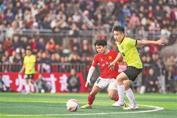 1月4日,小瑞村足球队球员石龙(左)与盘踅村足球队球员在比赛中。当日,发源于贵州榕江县的“村超”正式拉开第三届赛事的序幕,108支参赛村队的3000余名球员将向新赛季的总冠军发起冲击。 新华社记者 杨文斌 摄