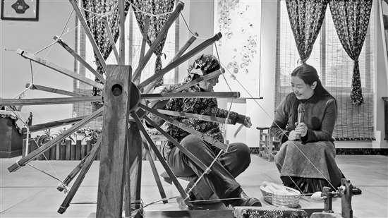 冬日的陕西省富平县美塬镇鸿雁村,一片“吱吱呀呀”的纺线、织布声。这是返乡创业的张永宁(右)创立的木兰摇粗布家纺有限公司生产旺季的声音。图为张永宁与留守老人向来访客人介绍土布工艺。
