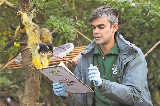 近日,英国伦敦动物园对园内饲养的动物进行一年一度的大盘点,测量动物的身长体重等数据。图为近日在英国伦敦动物园,一名工作人员对松鼠猴进行盘点。新华社发