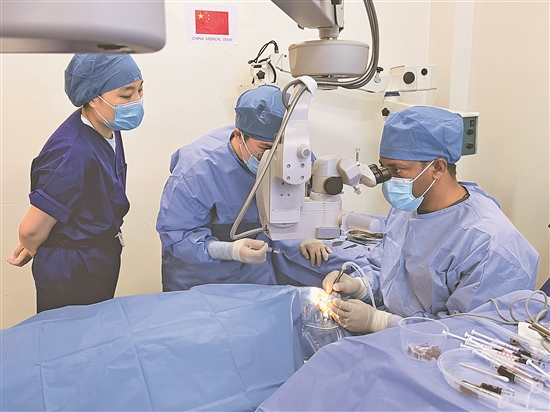 埃塞俄比亚“光明行”项目启动仪式近日在埃塞俄比亚首都亚的斯亚贝巴蒂鲁内什-北京医院举行,该项目预计将帮助500名埃塞患者重获光明。图为近日在亚的斯亚贝巴蒂鲁内什-北京医院,中国医生与埃塞医生为当地患者实施白内障手术。