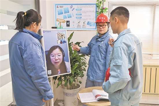 中国石化扬子石化把医疗服务送到一线职工身边,首台“健康咨询智慧屏”在该公司热电厂试用,该智慧屏为职工提供主治医师24小时视频在线咨询服务,实现在线解答健康咨询、体检报告解读、常见病咨询、用药指导等功能,呵护职工身心健康。图为2024年12月 27日班组员工对冬季皮肤过敏进行线上咨询。张琳 文 李树鹏 摄