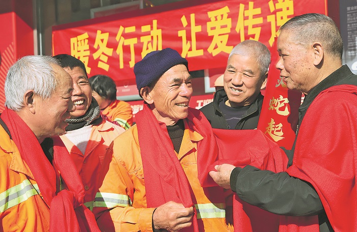 1月2日,浙江省台州市路桥区横街镇的老干部为环卫工人、快递小哥送上围巾等御寒物品。当日,路桥区横街镇组办、镇总工会连同路桥工商银行横街支行开展“暖冬行动 让爱传递”活动,为户外劳动者送上围巾、手套、棉帽以及春联等。本报通讯员 蒋友青 摄