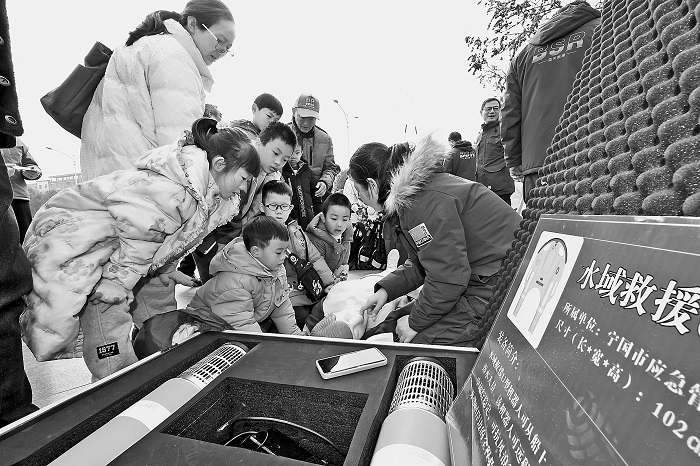 1月5日,安徽省宁国市公安局围绕“人民公安从这里走来”主题,应邀市总工会、检察院、法院、司法以及应急管理等部门联合举办“守正创新110 协同高效护安宁”警营开放日系列活动。图为蓝天救援队员向群众宣介水域救援知识。