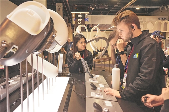 近日,人们在美国拉斯维加斯消费电子展上的中国企业韶音科技展区体验产品。新华社发(曾慧 摄)