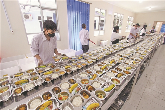 印度尼西亚政府日前正式启动免费营养餐计划,旨在减少儿童营养不良和发育迟缓问题,提高国民健康水平。图为近日,工作人员在印度尼西亚梭罗准备营养餐。