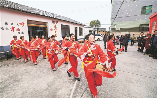 1月7日,腰鼓队在赵家镇保安新村爱心食堂前给村民表演节目。