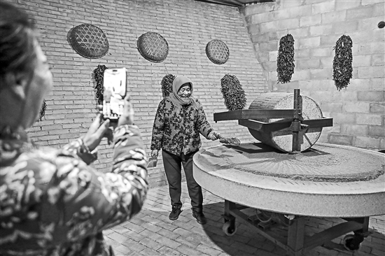 1月7日,在甘肃省庆阳市环县洪德镇耿塬畔村,村民直播辣椒面制作场景。