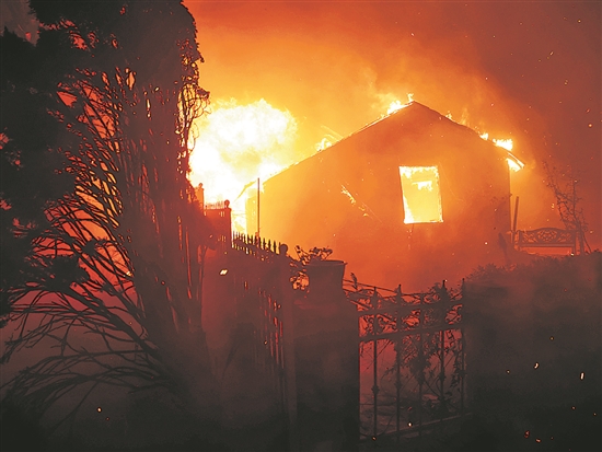 图为近日,在美国加利福尼亚州南部洛杉矶县沿海社区帕西菲克帕利塞兹,野火吞噬房屋。