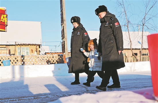 近日,黑龙江省漠河市北极镇洛古河村最低气温突破零下40℃,史先强夫妻把4岁的儿子送到村民家后,像往常一样来到中俄界江黑龙江踏雪巡边。