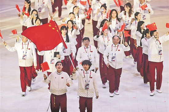 中国大学生体育代表团在大冬会开幕式上入场。新华社记者 李京 摄