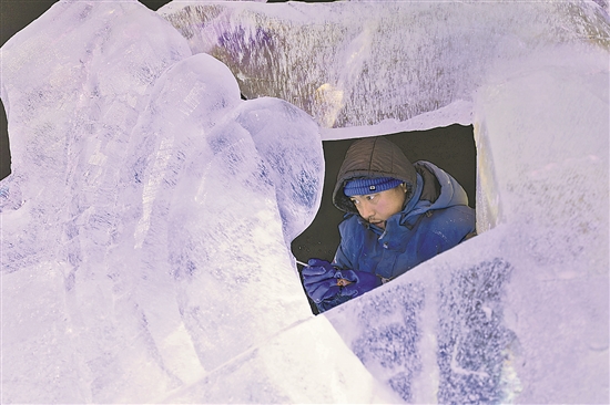 1月15日,参赛选手在哈尔滨冰雪大世界园区进行冰雕创作。
