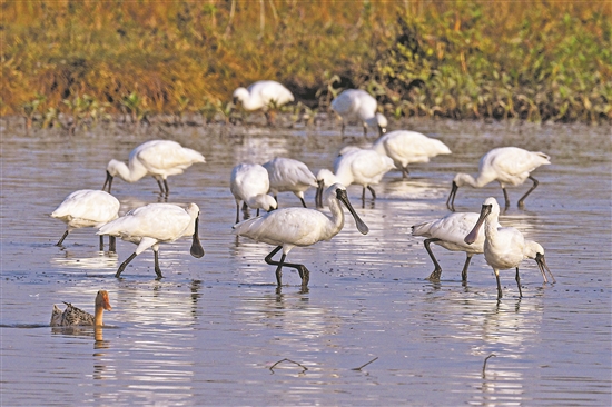近日,不少黑脸琵鹭在儋州湾湿地觅食、飞翔,成为冬日一道独特风景。黑脸琵鹭是世界珍稀濒危鸟类、国家一级重点保护野生动物。近年来,当地通过退塘还湿、栽种红树林、巡护鸟类等方式,不断加强滩涂湿地修复和鸟类保护,湿地生物多样性日益丰富。新华社记者 蒲晓旭 摄