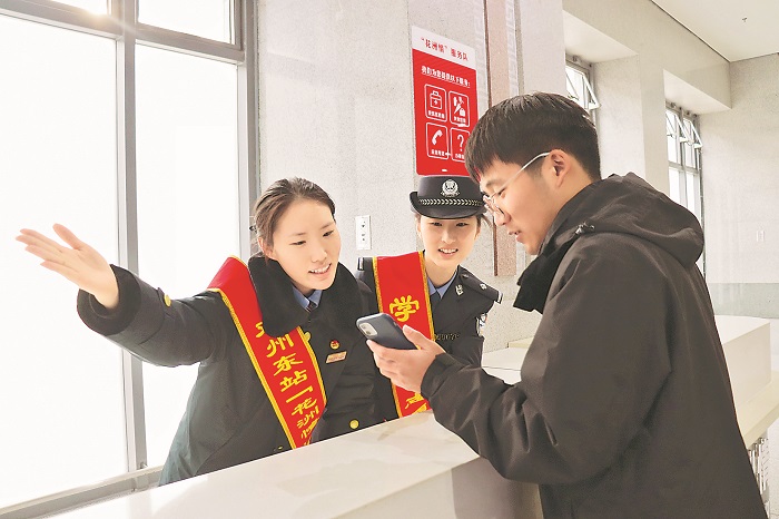 随着春运大幕拉开,洛阳铁路公安处邓州东站派出所积极应对大客流,持续擦亮“雷锋铁警党支部”党建品牌,在进站口设置青年突击队、便民服务台等,开展各类便民利民服务活动,重点关注老年人、儿童及携带大件行李的乘客,做好购票指引、解答问询、旅客帮扶等暖心服务,全力确保群众平安便捷出行。孙富常 摄