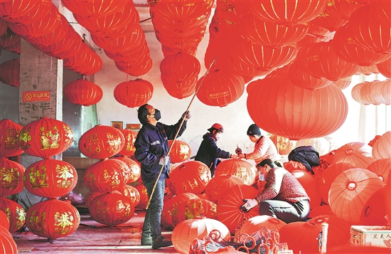 春节临近,河北省多地灯笼制作工坊赶制大红灯笼,供应节日市场。