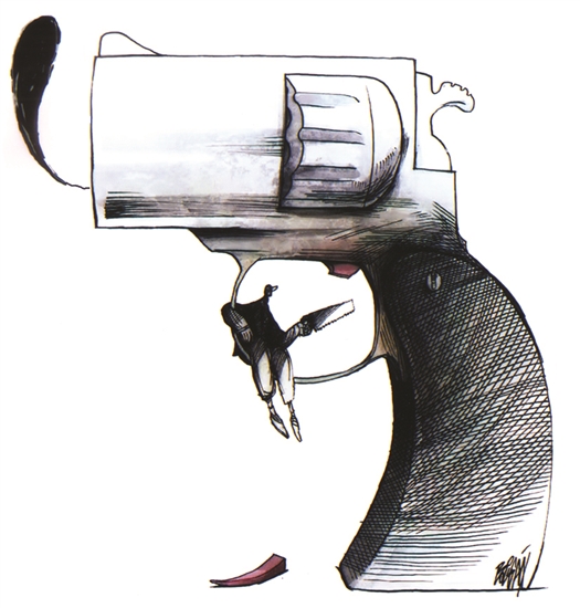 手枪象征着武力和暴戾,而平凡的“小人物”却敢奋不顾身地锯掉枪扳机。地球人都应为制止战争、暴力而发声。