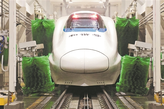 春运期间, 动车组全部上线运行,中国铁路太原局集团有限公司太原车辆段动车所洗车库的作业时间也从平时的23时结束延长至凌晨三四点。该洗车库自投用以来,每年约完成2500余次动车组清洗工作。