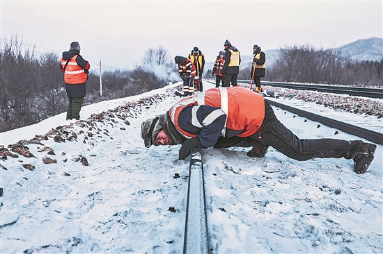 春运来了,中国铁路哈尔滨局集团有限公司绥化工务段组织工人对管内客车径路线路设备进行全面检查。数九以后,管内绥佳线最低温度零下33摄氏度,工人们起早贪黑与时间“赛跑”,除雪、扫冰、整治不良处所,防止钢轨折断。