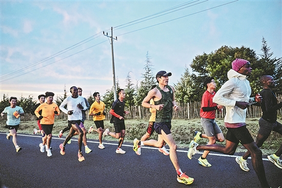 近日,包括中国男子马拉松纪录保持者何杰在内的14名中国马拉松运动员,在肯尼亚埃尔多雷特开展集训,与当地运动员进行合练,提升竞技水平。图为中国运动员与当地运动员一起训练。新华社记者 王冠森 摄